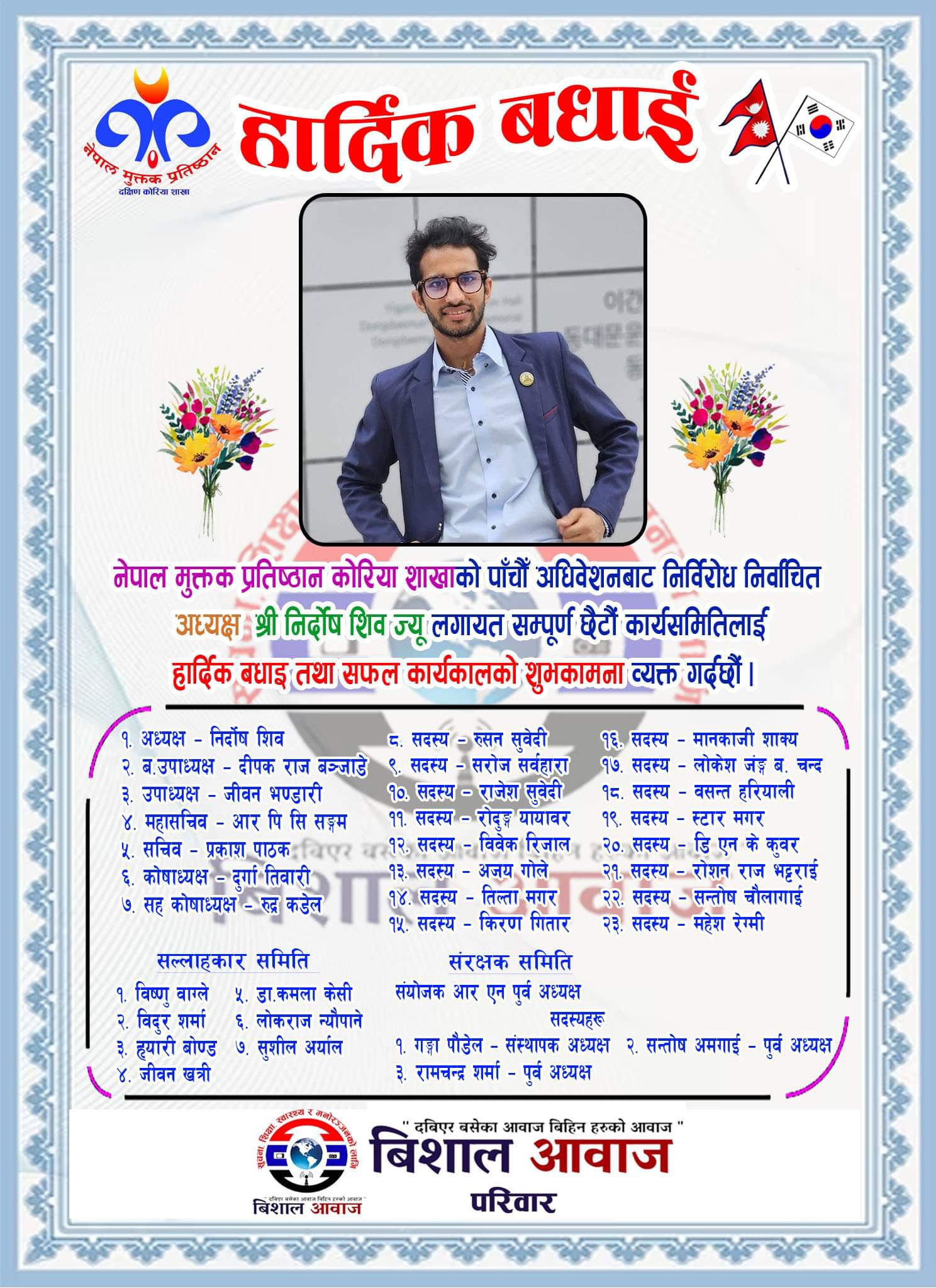 विशाल आवाज: नेपाली मुक्तकको विकास र विस्तारका लागि स्थापित नेपाल मुक्तक प्रतिष्ठान दक्षिण कोरिया शाखाको आइतबार भर्चुअल माध्यम जुमबाट सम्पन्न पाँचौं अधिवेशनबाट निर्दोष शिवको अध्यक्षमा नयाँ कार्यसमिति चयन भएको छ।