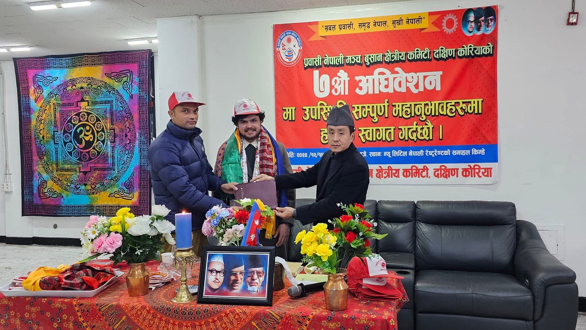 आइतबार किम्हे शहरको न्यु लिटिल नेपाली रेष्टुरेन्टको हलमा सम्पन्न प्रवासी नेपाली मञ्च बुसान क्षेत्रिय कमिटीको सातौ अधिवेशनले सर्वसम्मत रुपमा शिव विश्वकर्माको नेतृत्वमा १३ सदस्यिय नया कार्यसमिति चयन गरेको हो। नयाँ कार्यसमितिको अध्यक्षमा शिव विश्वकर्मा उपाध्यक्षमा तेजु गुरुङ ,सचिवमा धनञ्जय न्यौपाने ,उपसचिवमा सुमन अधिकारी र सदस्यहरुमा अञ्जु गुरुङ,उत्सव चौधरी,अजय गुरुङ,जिवन तामाङ ,केपी जोशी,सागर पराजुली र बद्री पौडेल चयन भएका छन्। यसैगरी एक जना सदस्य पछि चयन गर्ने कमिटीले जनाएको छ।