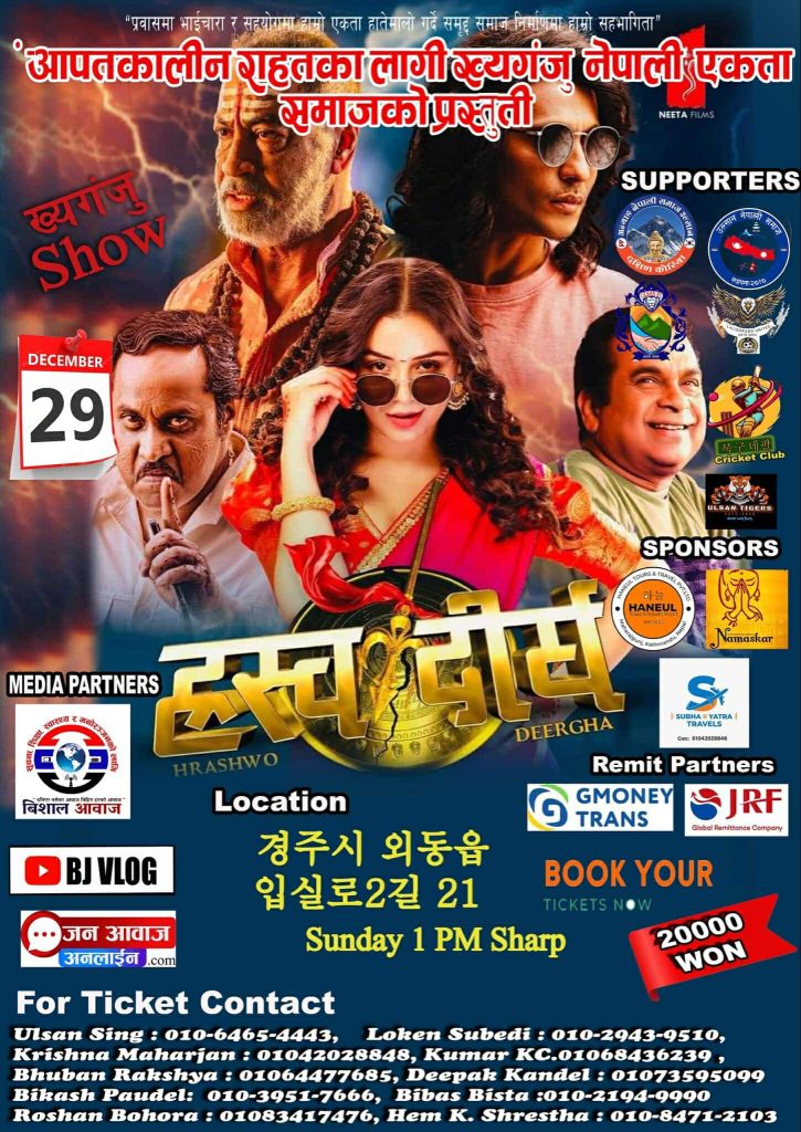 नेपाली र दक्षिण भारतीय कलाकारहरुको ‘पल्टन’ नै उतारिएको फिल्म ‘ह्रस्व दीर्घ’ ख्यङ्जु नेपाली एकता समाजले ख्यङ्जु स्थित 경주시 외동읍 입실로2길 21 मा डिसेम्बर २९ तारिख आइतबारका दिन दिउसो १:०० बजे प्रदर्शन गर्ने भएको हो।