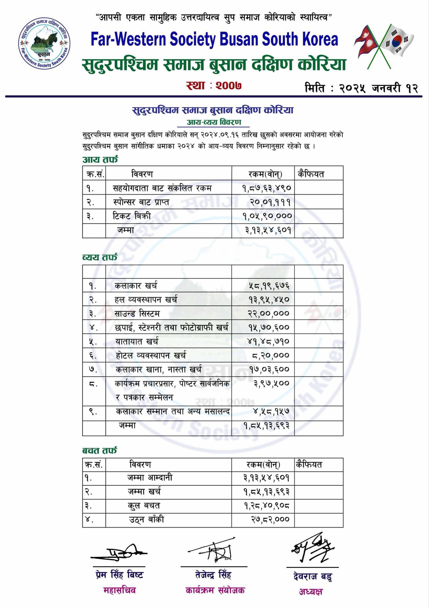 कोरियन महान चाड छुसकको अवसर पारि सुदूरपश्चिम समाज बुसान दक्षिण कोरियाको आयोजनामा सेप्टेम्बर १६ तारिखका दिन बुसान स्थित Eunseok cultural & welfare center आयोजित “सुदुरपश्चिम बुसान सांगीतिक धमाका-२०२४’ को किम्हे स्थित न्यू लिटल इन्डिया रेस्टुरेन्ट मा एक कार्यक्रम गरी आय व्यय सार्वजनिक सार्वजनिक गरिएको हो।