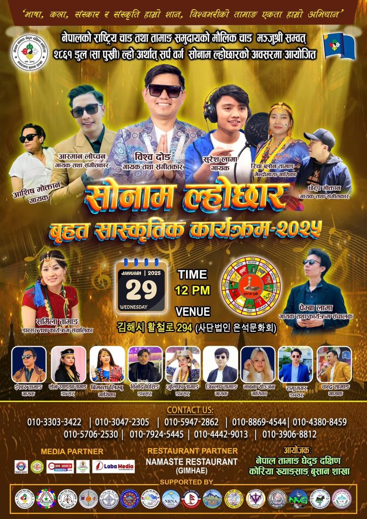 “भाषा, कला,संस्कार र संस्कृति हाम्रो शान, विश्वभरिको तामाङ एकता हाम्रो अभियान भन्ने मूल नाराका साथ स्थापित नेपाल तामाङ घेदुङ दक्षिण कोरिया ख्याङसाङ् बुसान शाखाको आयोजनामा जनवरी २९ तारिख बुधबारका दिन किम्हे बुसान स्थित 김해시 활청로 294 (사단법인 운석 문화회) मा सोनाम ल्होछार बृहत सांस्कृतिक कार्यक्रम २०२५ आयोजना हुने भएको हो।