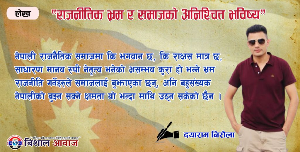 नेपालीलाई सबैभन्दा धेरै केहि कुरा थाहा छ भने त्यो राजनीति हो । बहुसंख्यक नेपालीले राजनीति भनेर बुझेको सवाल नै वाद, तन्त्र, पार्टी, जात, वर्ग, धर्म र व्यक्ति विशेषको समर्थन वा विरोध, जिन्दावाद वा मुर्दावाद, तर्क वा कुतर्क, आलोचना वा प्रशंसा मात्रै हो । नेपाली राजनैतिक समाजमा कि भगवान छ, कि राक्षस मात्र छ, साधारण मानव रुपी नेतृत्व भनेको असम्भव कुरा हो भन्ने भ्रम राजनीति गर्नेहरुले समाजलाई बुझाएका छन् अनि बहुसंख्यक नेपालीको बुझ्न सक्ने क्षमता यो भन्दा माथि उठ्न सकेको छैन । राजनीतिमा निष्ठा र नैतिकता अनि नागरिकमा चेतना र मानवीय विवेक प्रयोग गर्न सक्ने सामाजिक पारदर्शिता हुनुपर्छ तब मात्र सेवामुलक राजनीति गर्ने नेतृत्वको उदय हुन्छ । मुलुक आधुनिक, विकसित र चेतनशील भएर उदाँउन आफ्नो भागमा परेको जिम्मेवारी निर्वाह सबैले अनुशासित भएर गर्नुपर्छ । बिडम्वना हाम्रो देशको परिवेशमा प्रायः सबैलाई आफ्नो काम, कर्तव्य र दायित्व पुरा गर्ने भन्दा पनि राजनीति भन्दा बाहिर सोच्न फुर्सद नै छैन । कोहि नेता, कोहि कार्यकर्ता, कोहि ढोगी, कोहि कट्टर समर्थक, कोहि कट्टर आलोचक, कोहि भरिया भएर दिनचर्या बितिरहेको छ ।