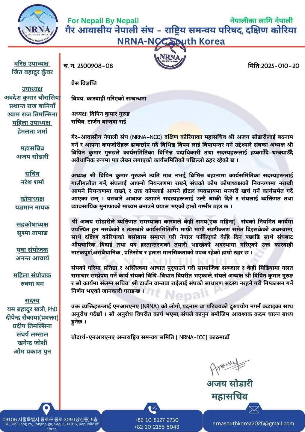 рджрдХреНрд╖рд┐рдг рдХреЛрд░рд┐рдпрд╛рд╕реНрдерд┐рдд рдЧреИрд░тАУрдЖрд╡рд╛рд╕реАрдп рдиреЗрдкрд╛рд▓реА рд╕рдВрдШ (NRNA NCC Korea) рднрд┐рддреНрд░рдХреЛ рдЖрдиреНрддрд░рд┐рдХ рд╡рд┐рд╡рд╛рджрд▓реЗ рдЕрд╣рд┐рд▓реЗ рдирдпрд╛рдБ рдореЛрдб рд▓рд┐рдПрдХреЛ рдЫред