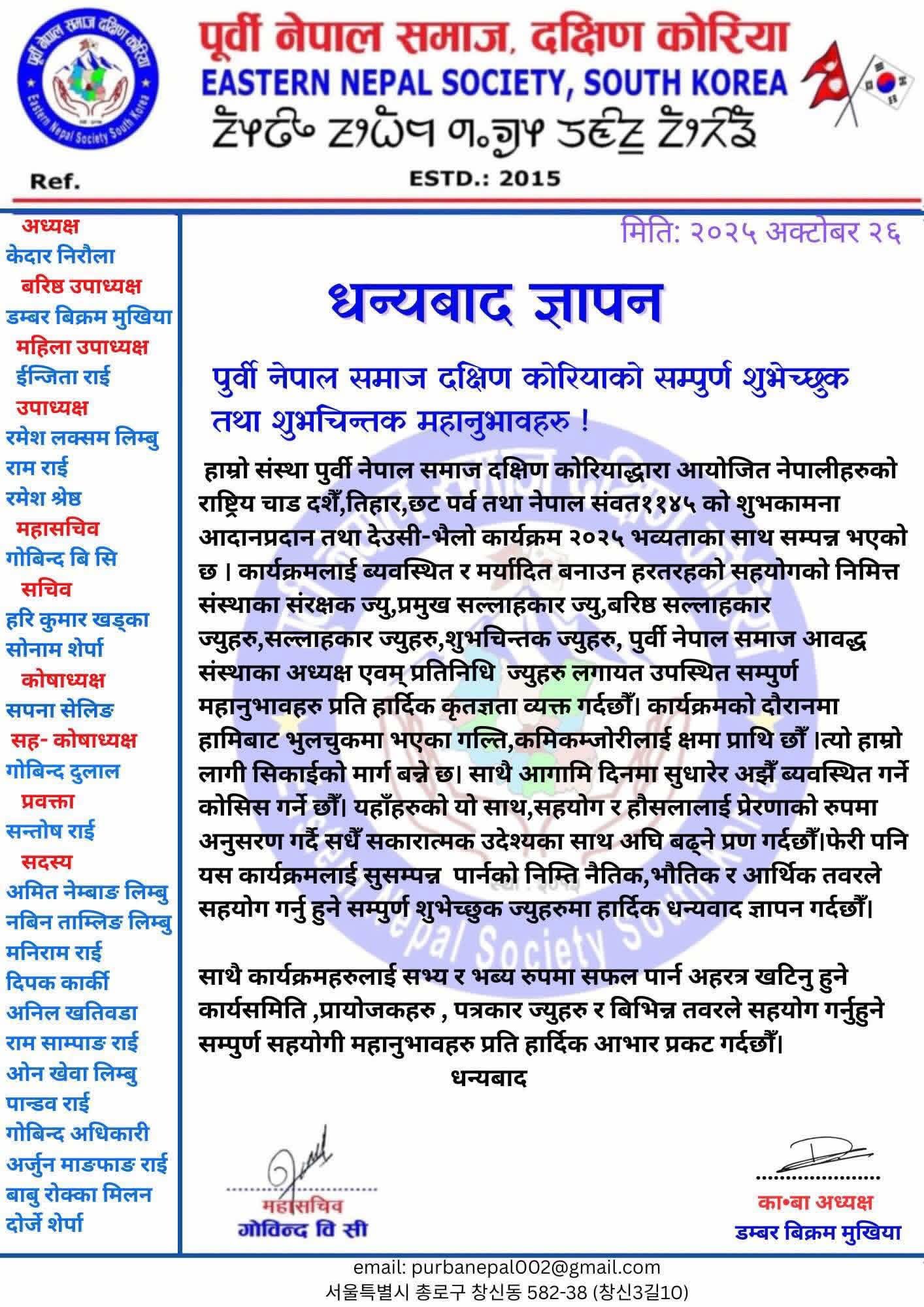 पूर्वी नेपाल समाज, दक्षिण कोरियाले २५ अक्टोबर २०२५, शनिबार साँझ निक नेपाल ट्राभल्सको सभाहल, दोङ्देमुनमा दशैं, तिहार, छठ र नेपाल सम्बत ११४६को अवसरमा भव्य शुभकामना आदान–प्रदान कार्यक्रम २०२५ सम्पन्न गरेको छ।