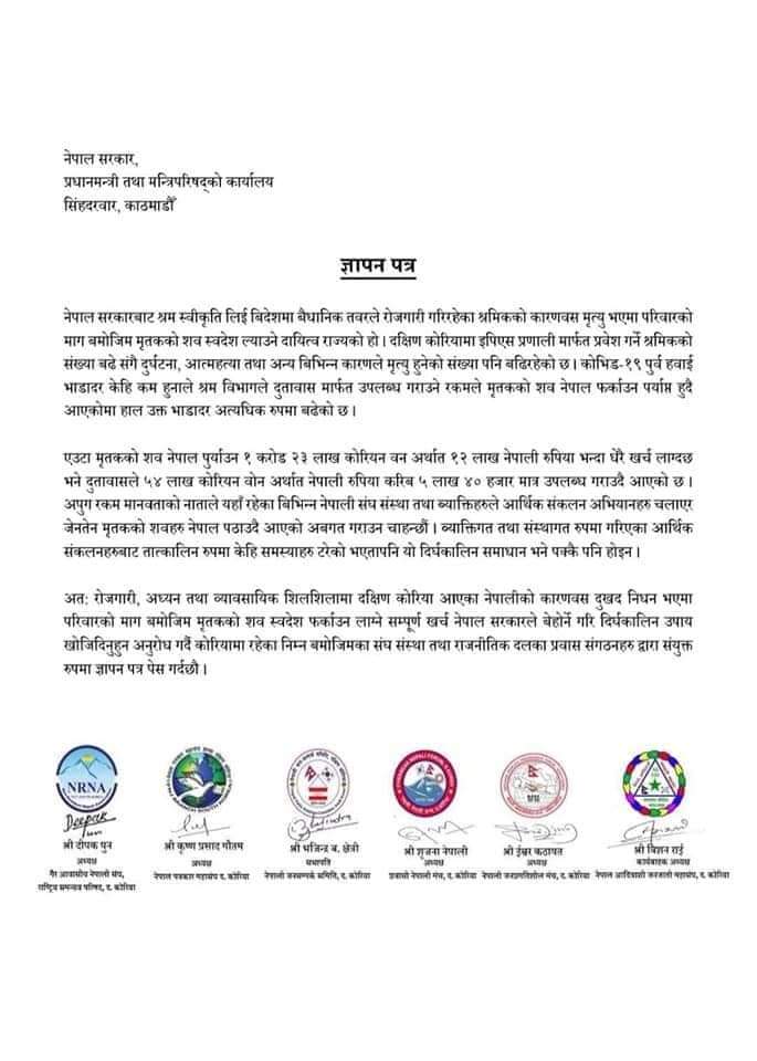 सरकारबाट श्रम स्विकृती लिई दक्षिण कोरियामा वैधानिक रुपमा बसोवास गरी रोजगार गरिरहेका नेपाली श्रमिकको कुनै कारणवस मृत्यु भएमा उक्त मृतकको शव नि:शुल्क स्वदेश फर्काउनु पर्ने माग राख्दै विभिन्न संघ-संस्था तथा कोरियामा रहेका नेपाली समुदायले नेपाल सरकार तथा प्रधानमन्त्री पुष्पकमल दाहाललाई ज्ञापन पत्र बुझाएका छन ।