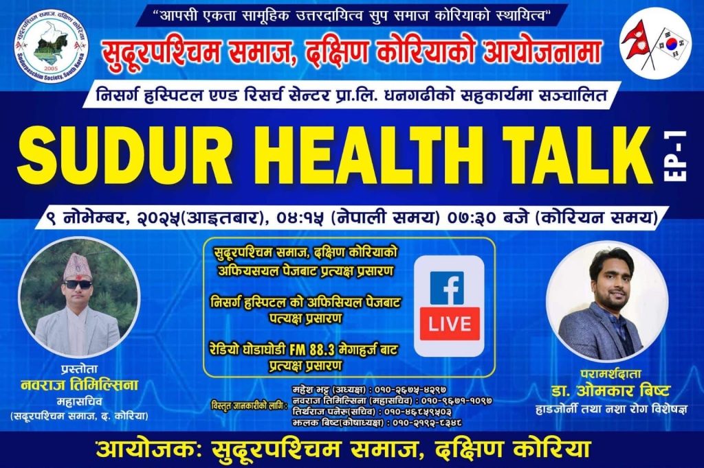 सुदूरपश्चिम समाज, दक्षिण कोरियाले स्वास्थ्य सचेतना अभिवृद्धिका लागि नयाँ अभियानका रूपमा ‘SUDUR HEALTH TALK’ नामक नियमित स्वास्थ्य परामर्श कार्यक्रम सुरु गर्न लागेको छ।