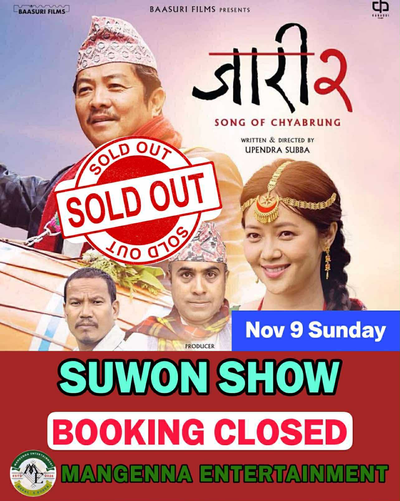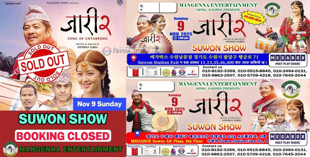 Manggena Entertainment को आयोजनामा यहि नोभेम्बर ९ (आइतबार) का दिन सुवनको Ak plaza र 팔달문 मा रहेको २ ओटै सुबीधासम्पन्न 𝐌𝐄𝐆𝐀 𝐁𝐎𝐗 मा प्रदर्शन हुन लागेको ‘जारी २’ को शोप्रति कोरियामा रहेका नेपाली दर्शकहरूको उत्साह अत्यधिक देखिएको छ।