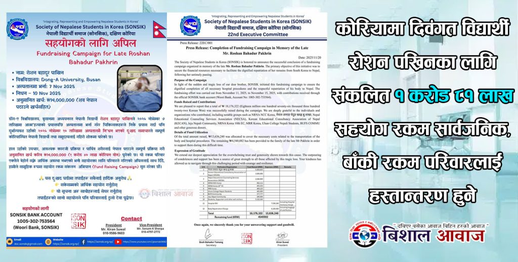 गत नोभेम्बर ७ तारिकका दिन आत्महत्याको प्रयास पश्चात उपचारका लागि तत्काल अस्पताल पुर्याइएको दोङ ए विश्वविद्यालय बुसानमा अध्यनरत नेपाली विद्यार्थी रोशन बहादुर पख्रिनको उपचारको क्रममा २०२५ नोभेम्बर १० तारिक मृत्यु भएपछि उनको उपचार खर्च र शव नेपाल पठाउन लागेको खर्चमा सहयोग गर्न नेपाल विद्यार्थी समाज, दक्षिण कोरिया (SONSIK) र अन्य संघ–संस्थाले सहयोग अभियान सञ्चालन गरी आवश्यक रकम सङ्कलन गरेको छ।