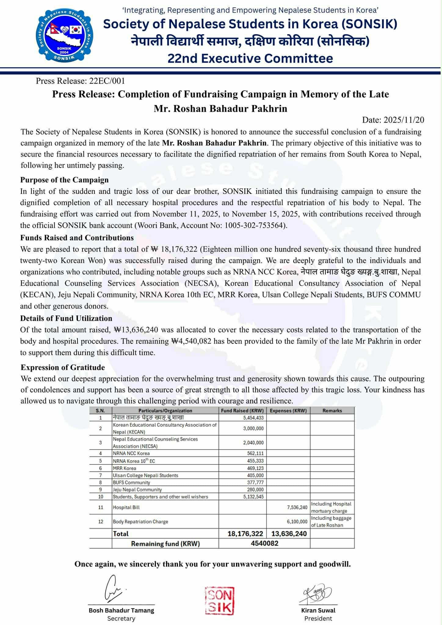 SONSIK का पदाधिकारीहरूले सार्वजनिक विज्ञप्ति मार्फत सबै सहयोग र योगदानप्रति गहिरो आभार व्यक्त गरेका छन् र आर्थिक सङ्कलन तथा खर्चको पूर्ण पारदर्शिता सुनिश्चित गरिएको बताएका छन्। सो संस्थाले बाँकी रहेको रकम पख्रिन परिवारलाई हस्तान्तरण गर्ने निर्णय गरिसकेको र हस्तान्तरण प्रक्रियामा परिवारसहित समन्वय भइरहेकाले निकट भविष्यमै औपचारिक रूपमा रकम उपलब्ध गराइने जनाएको छ।