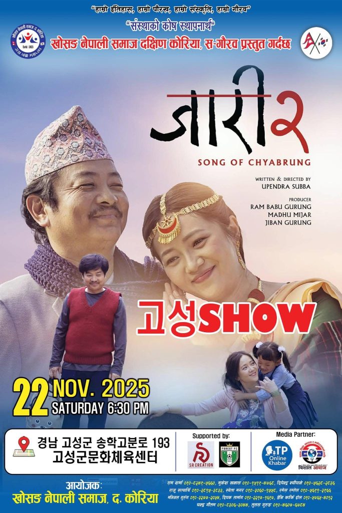 खोसङ नेपाली समाजको को आयोजनामा भोली शनिबारका दिन साझ ६:३० बजे 고성국문화체육센터 मा प्रदर्शन हुन लागेको ‘जारी २’ को शोप्रति कोरियामा रहेका नेपाली दर्शकहरूको उत्साह अत्यधिक देखिएको छ।