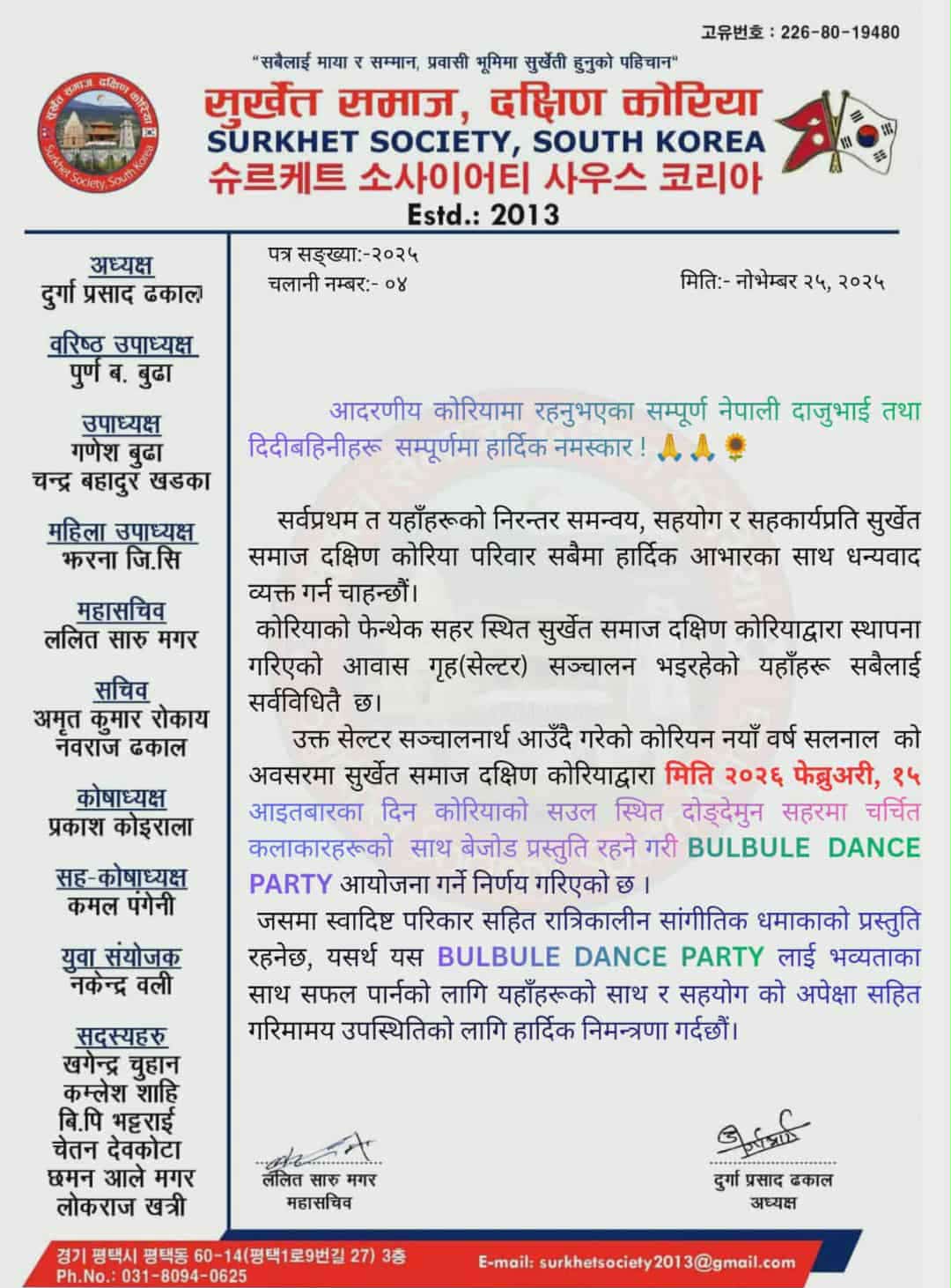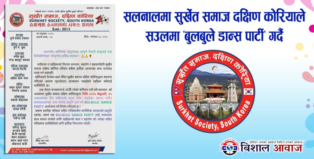 सुर्खेत समाज, दक्षिण कोरियाले आउँदो कोरियन नयाँ वर्ष सलनाल (Seollal) को विशेष अवसरमा भव्य ‘Bulbule Dance Party’ आयोजना गर्ने भएको छ।