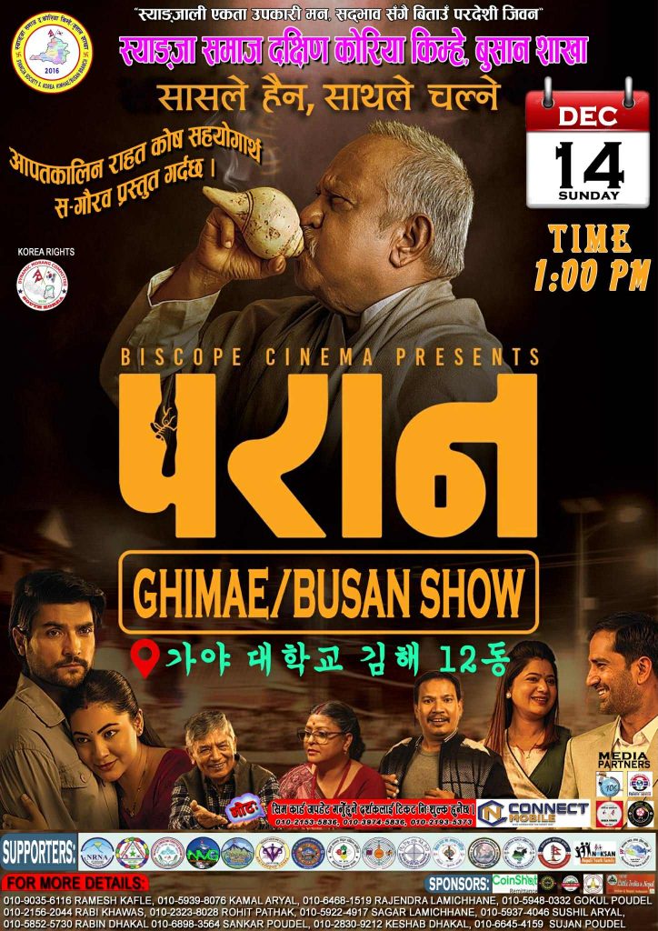 सर्वाधिक कमाइ गर्दै २०८२ सालको मेगा–हिट नेपाली फिल्म ‘परान’ कोरियामा पनि धमाकेदार रूपमा प्रदर्शन हुने भएको छ। स्याङ्जा समाज दक्षिण कोरिया (किम्हे/बुसान शाखा) को आयोजनामा डिसेम्बर १४, आइतबार विशेष शो हुने भएको छ।