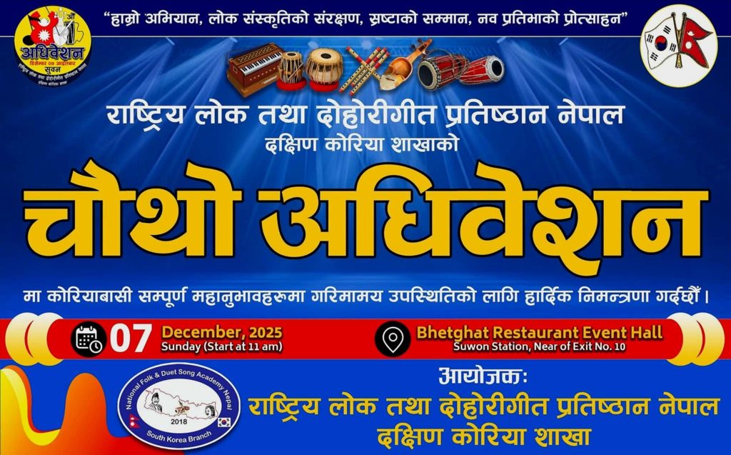 सिओल । दक्षिण कोरियामा क्रियाशील राष्ट्रिय लोक तथा दोहोरीगीत प्रतिष्ठान नेपाल, दक्षिण कोरिया शाखाले आफ्नो चौथो अधिवेशन यही २०२५ डिसेम्बर ७ (आइतबार)का दिन गर्ने भएको छ। संस्थाले सार्वजनिक गरेको जानकारीअनुसार अधिवेशन सुबह ११:०० बजेबाट भेटघाट रेस्टुरेन्टको सभाहल, सुवनमा आयोजना हुने छ।