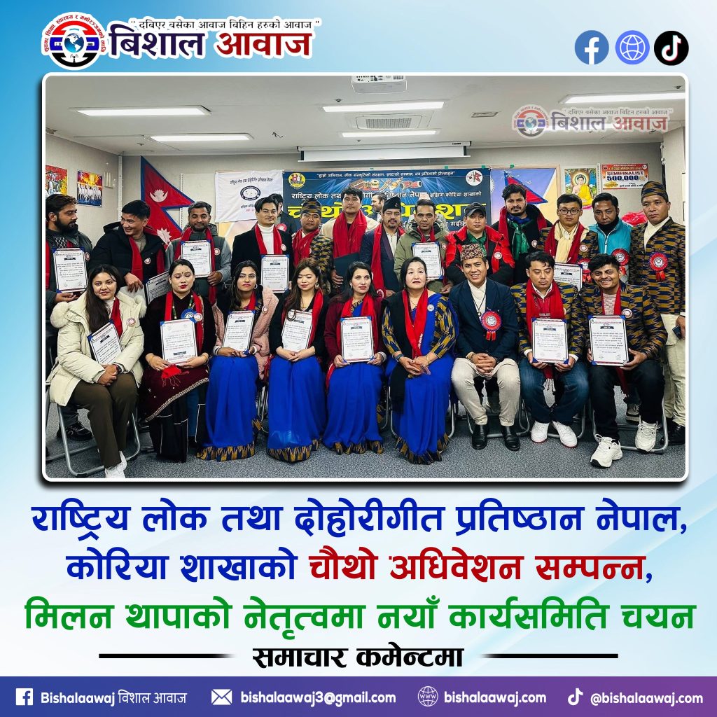 राष्ट्रिय लोक तथा दोहोरीगीत प्रतिष्ठान नेपाल, कोरिया शाखाको चौथो अधिवेशन सम्पन्न हुँदै नयाँ कार्यसमिति सर्वसम्मत रूपमा चयन भएको छ। अधिवेशनबाट अध्यक्षमा मिलन थापा निर्वाचित भएका छन्।
