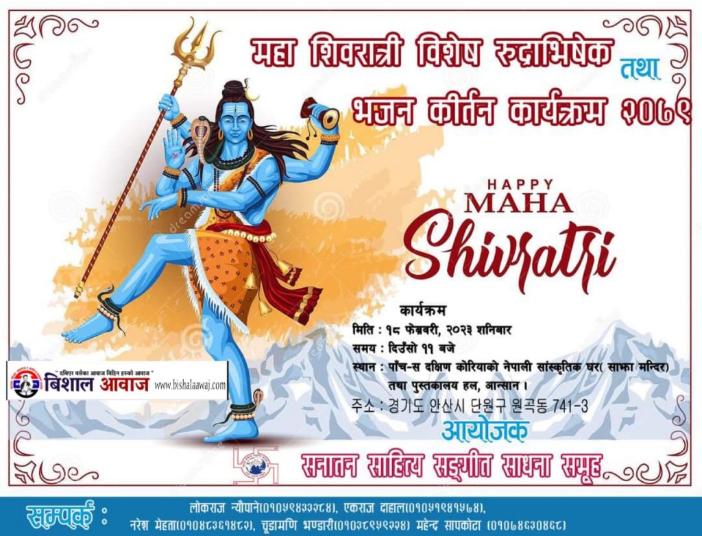 “पाँच-स” दक्षिण कोरियाको नेपाली सास्कृतीक घर (साझा मन्दिर) तथा पुस्तकालयको हल, आन्सान ( 경기도 안산시 단원구 원곡동 741-3) मा महा शिवरात्रीको पावन अवसर पारी यही मिति सन २०२३ फेब्रुअरी १८ तारिक शनिबारका दिन बिहान ११ बजे देखि ३ बजेसम्म रूद्राभिषेक तथा भजन कीर्तन कार्यक्रम गर्ने भएको हो।