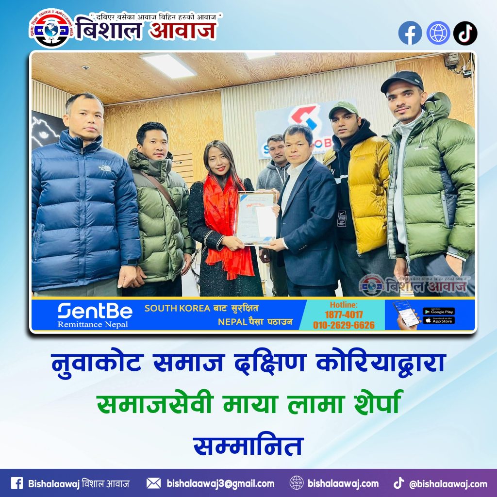दक्षिण कोरियामा क्रियाशील नुवाकोट समाज दक्षिण कोरियाले समाजसेवी तथा काउन्सेलर माया लामा शेर्पालाई कदर पत्रसहित सम्मान गरेको छ।