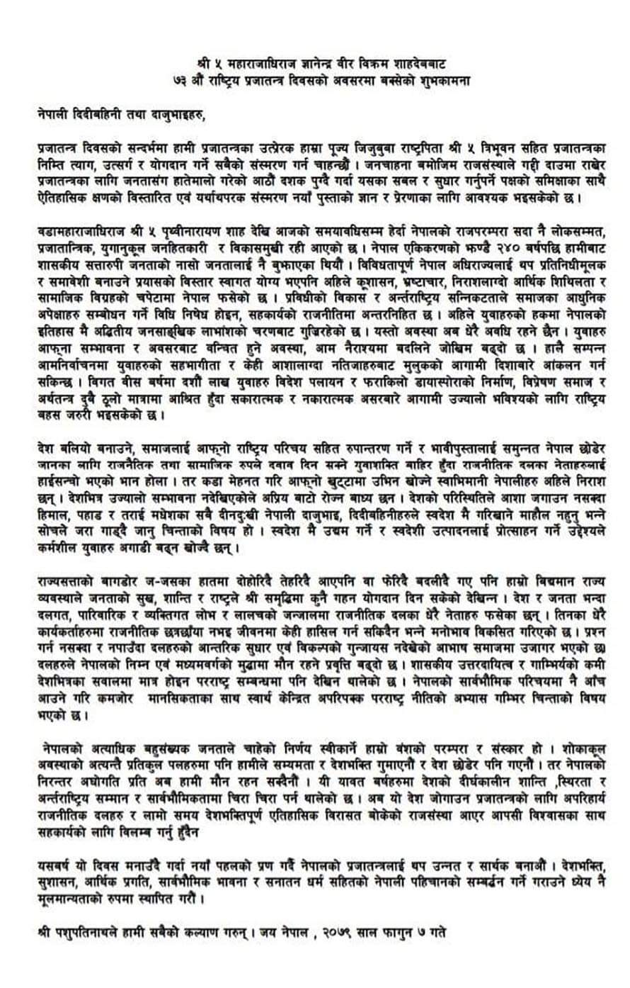 बहुसंख्यक नेपाली जनताले चाहेको निर्णय स्वीकार्ने राजसंस्थाको परम्परा रहेको, तर मुलुक प्रतिकुल अवस्थामा रहेकाले मौन रहन नसक्ने उनले बताएका छन् । पूर्वराजा ज्ञानेन्द्रको वक्तव्यमा भनिएको छ, ‘शोकाकुल अवस्थाको अत्यन्तै प्रतिकुल पलहरुमा पनि हामीले संयमता र देशभक्ति गुमाएनौं र देश छोडेर पनि गएनौं । तर नेपालको निरन्तर अधोगतिप्रति अब हामी मौन रहन सक्दैनौं ।’