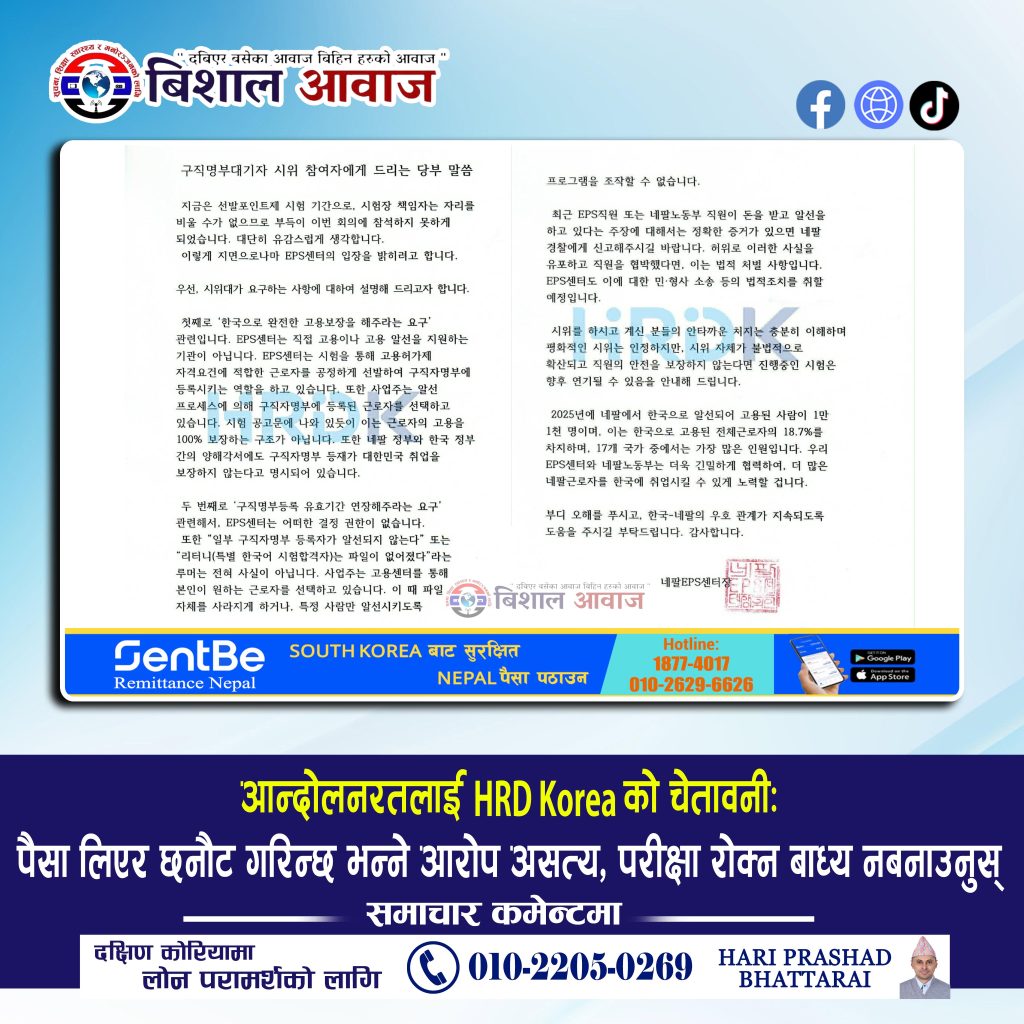 कोरिया रोजगार अनुमति प्रणाली (EPS) अन्तर्गत भइरहेको आन्दोलनका सन्दर्भमा EPS सेन्टर (HRD Korea) का प्रमुखले आन्दोलनरत पक्षलाई लक्षित गर्दै स्पष्ट धारणा सार्वजनिक गरेका छन्।