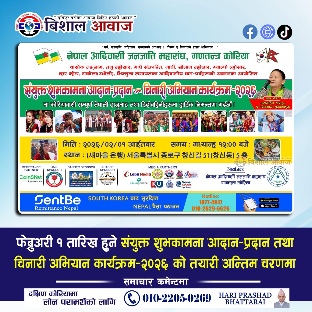 आदिवासी चाडपर्वहरूको उपलक्ष्यमा नेपाल आदिवासी जनजाति महासङ्घ, गणतन्त्र कोरियाको आयोजनामा हुन लागिएको “संयुक्त शुभकामना आदान–प्रदान तथा चिनारी अभियान कार्यक्रम–२०२६” को तयारी अन्तिम चरणमा पुगेको छ।