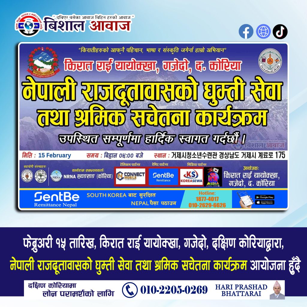 दक्षिण कोरियास्थित नेपाली राजदूतावासको राहदानी नवीकरण तथा श्रमिक अन्तरक्रिया कार्यक्रम गजेदोमा सञ्चालन हुने भएको छ।