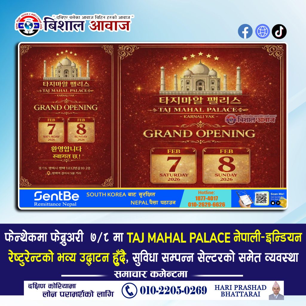 दक्षिण कोरियाको फेन्थेक (평택) क्षेत्रमा नेपाली तथा इन्डियन स्वादलाई एकै छानामुनि प्रस्तुत गर्ने उद्देश्यसहित ‘ताजमहल प्यालेस (Taj Mahal Palace)’ नेपाली–इन्डियन रेष्टुरेन्ट सञ्चालनमा आएको छ। यसको ओपनिङ यहि फेब्रुअरी ७/८ तारिकमा हुने भएको छ।