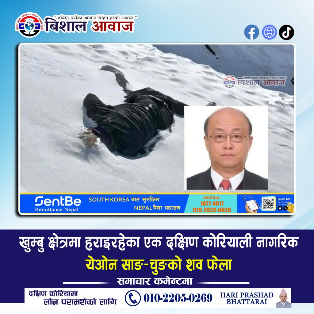 खुम्बु क्षेत्रमा हराइरहेका एक दक्षिण कोरियाली नागरिक येओन साङ–चुङको शव फेला परेको छ।