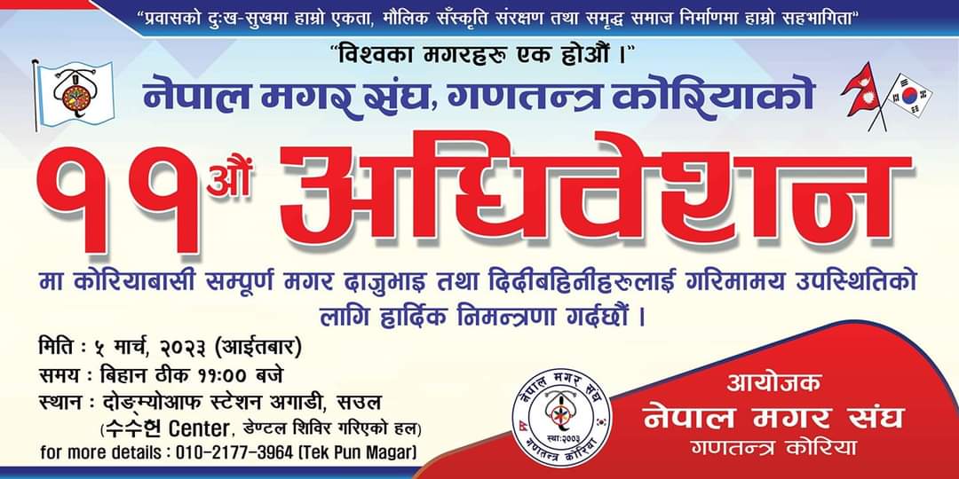 विशाल श्रेष्ठ/दक्षिण कोरिया: “प्रवासको दु:ख सुखमा हाम्रो एकता, मौलिक संस्कृति संरक्षण तथा समृद्ध समाज निर्माणमा हाम्रो सहभागिता” भन्ने मुल नारा लिएर सन् २००३ मा स्थापित नेपाल मगर संघ गणतन्त्र कोरियाको ११ औ अधिवेशन मार्च ५ तारिखका दिन हुने भएको छ।