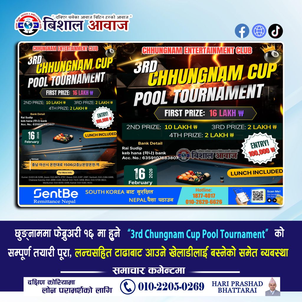दक्षिण कोरियाको छुङछन नाम्दो क्षेत्र अन्तर्गत ओन्याङ ओन्छनमा फेब्रुअरी १६ मा आयोजना हुन लागेको 3rd Chhungnam Cup Pool Tournament को सम्पूर्ण तयारी पूरा भएको आयोजकले जनाएको छ। छुङनाम युथ इन्टरटेनमेन्ट ग्रुपको आयोजनामा फेब्रुअरी १६, २०२६ मा हुने उक्त प्रतियोगिता कोरियन नयाँ वर्षको अवसर पारेर सञ्चालन गर्न लागिएको हो।