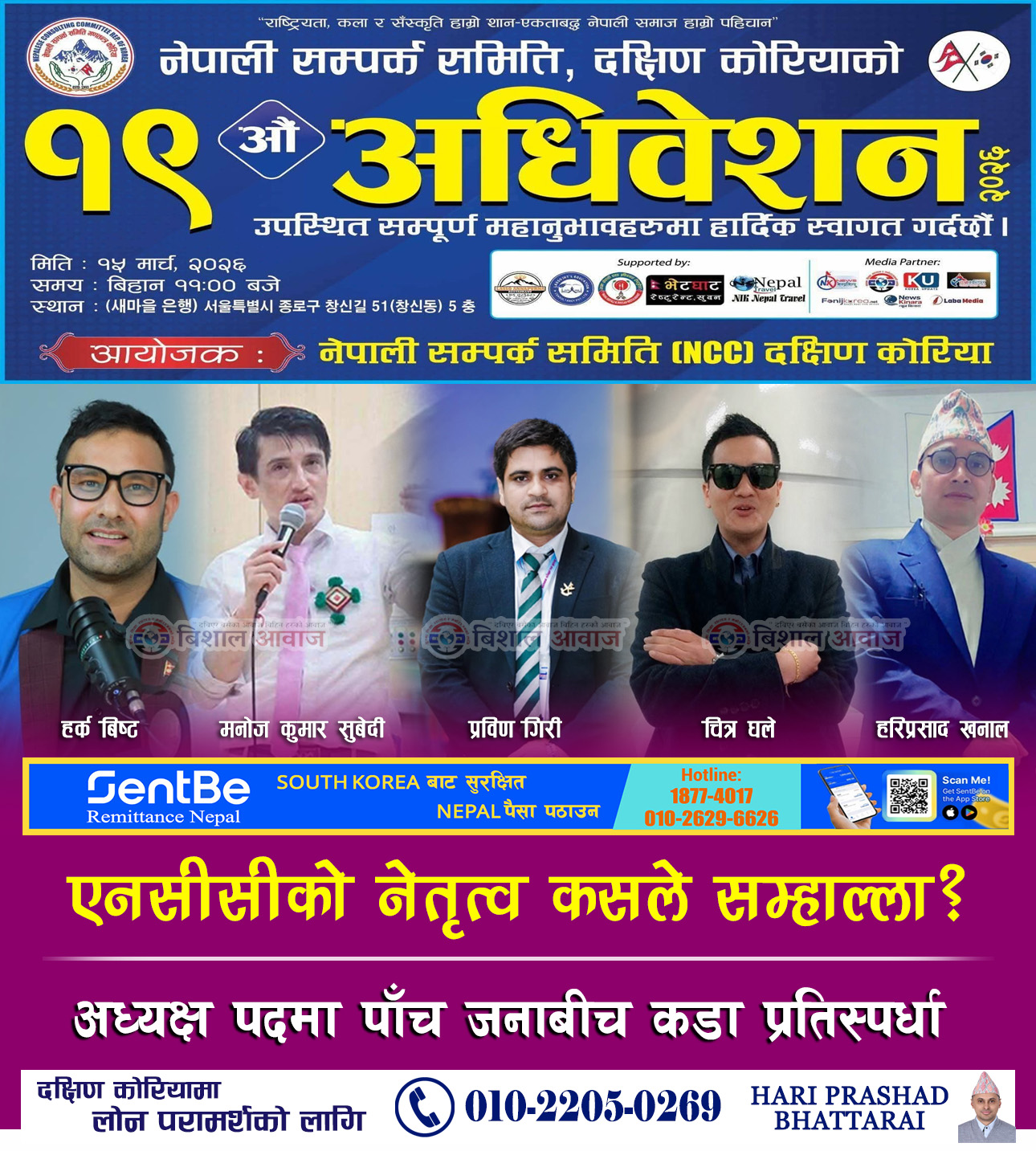 दक्षिण कोरियामा क्रियाशील नेपालीहरूको सामाजिक संस्था नेपाली सम्पर्क समिति (एनसीसी) दक्षिण कोरियाको १९औँ अधिवेशन भेलि सियोलमा आयोजना हुँदैछ। अधिवेशनमार्फत नयाँ नेतृत्व चयन गर्ने तयारी भइरहेका बेला अध्यक्ष पदका लागि पाँच जना आकांक्षी देखिएका छन्। अध्यक्ष पदका लागि हर्क बिष्ट, मनोज कुमार सुवेदी, प्रविण गिरी, चित्र घले र हरिप्रसाद खनालबीच कडा प्रतिस्पर्धा हुने संकेत देखिएको छ। यसपटक नेतृत्व कसले सम्हाल्ने भन्ने विषयले दक्षिण कोरियामा रहेका नेपाली समुदायबीच व्यापक चासो बढाएको छ।