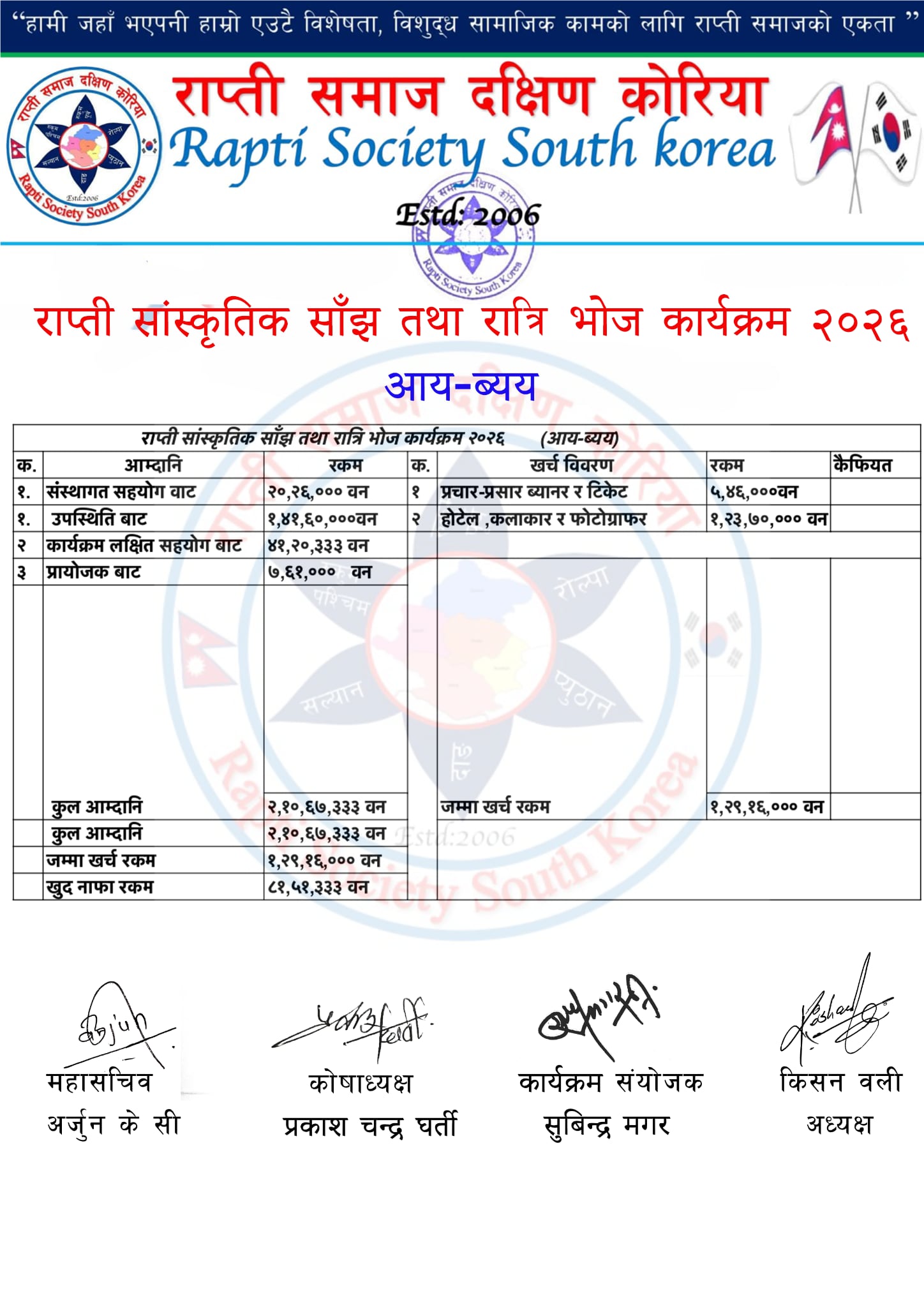 राप्ती समाज दक्षिण कोरियाले कोरियन नयाँ वर्ष तथा महाशिवरात्रि को पावन अवसरमा प्रवासी भूमिमा रहँदै आएका नेपाली समुदायबीच आपसी एकता, सद्भाव र भाइचारा कायम गर्नुका साथै मातृभूमिको कला–संस्कृतिको संरक्षण र प्रवर्द्धन गर्ने उद्देश्यले फेब्रुअरी १५, २०२६ मा आयोजना गरेको ‘राप्ती सांस्कृतिक साँझ तथा रात्री भोज कार्यक्रम २०२६’ को आय–व्यय विवरण सार्वजनिक गरेको छ।