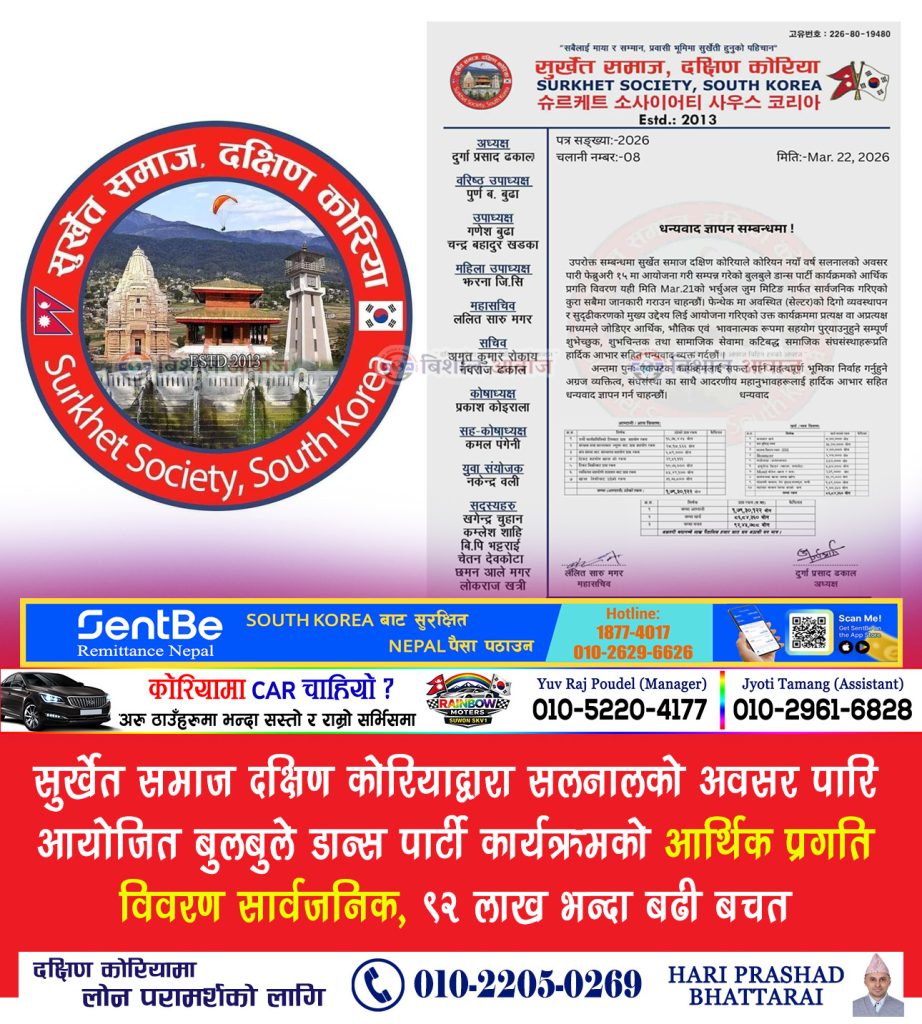 सुर्खेत समाज दक्षिण कोरियाले कोरियन नयाँ वर्ष सलनालको अवसरमा आयोजना गरेको ‘बुलबुले डान्स पार्टी’ कार्यक्रमको आर्थिक विवरण सार्वजनिक गरेको छ।