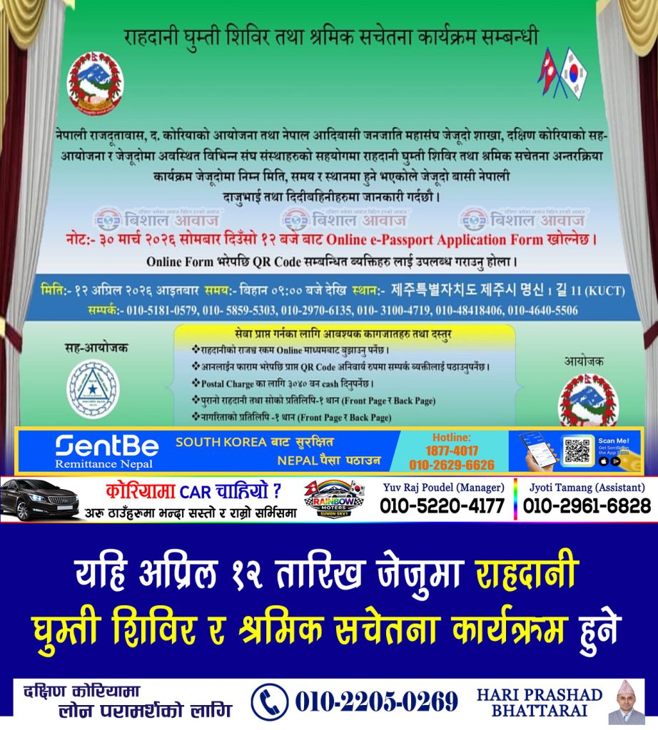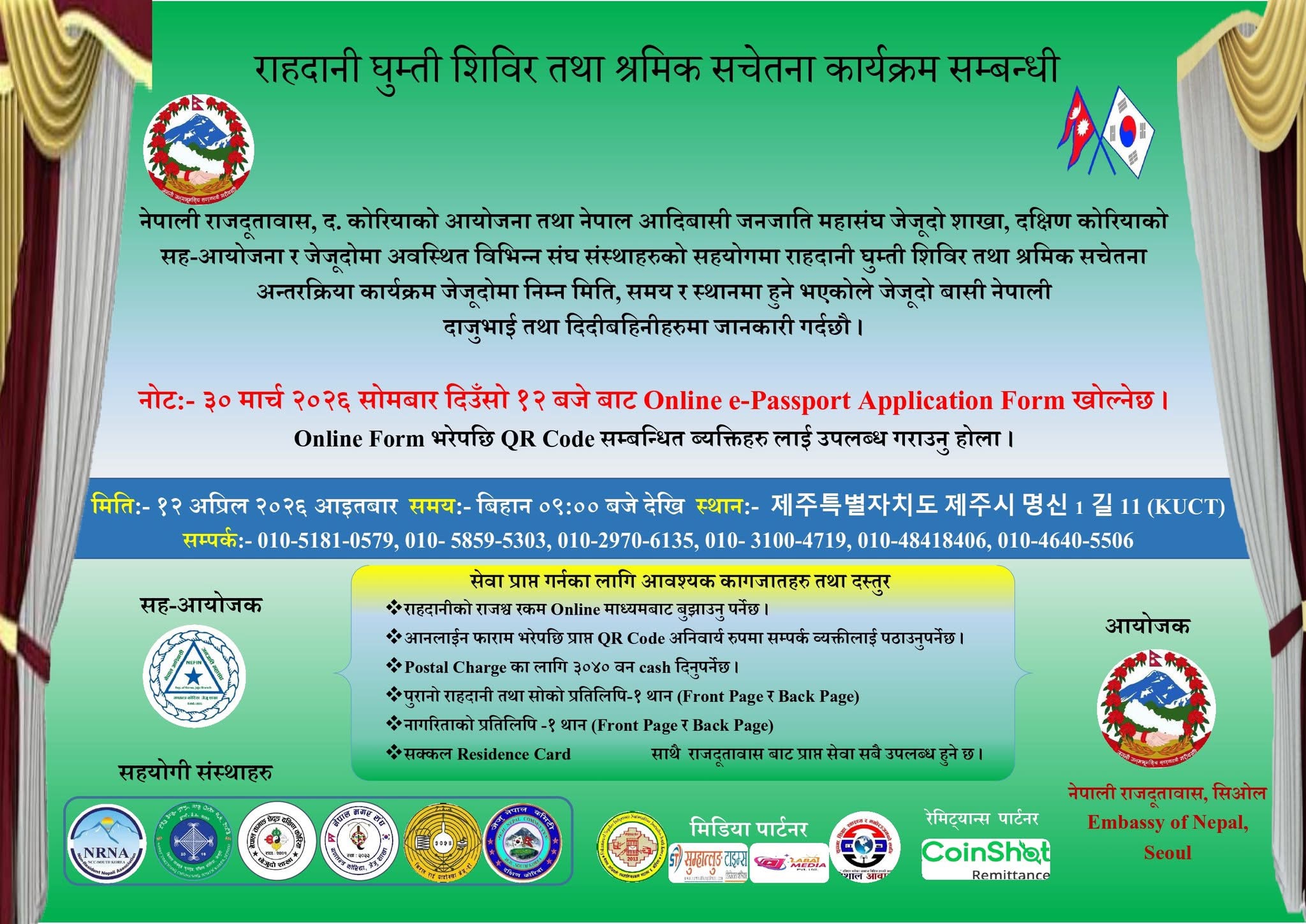 दक्षिण कोरियाको जेजुदो क्षेत्रमा रहेका नेपालीहरुका लागि राहदानी सेवा सहज बनाउन “राहदानी घुम्ती शिविर तथा श्रमिक सचेतना कार्यक्रम” आयोजना हुने भएको छ। उक्त कार्यक्रम Embassy of Nepal, Seoul को आयोजना तथा Nepal Federation of Indigenous Nationalities (NEFIN) दक्षिण कोरिया जेजुदो क्षेत्रीय समितिको सहकार्यमा हुन लागेको हो।