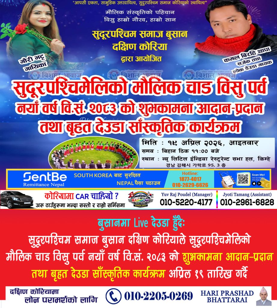 सुदूरपश्चिमीले मौलिक चाड विसु तथा नेपाली नयाँ वर्ष २०८३ को शुभकामना आदानप्रदान गर्नका लागि सुदूरपश्चिम समाज बुसान दक्षिण कोरियाले यहि अप्रिल १९ तारिख आइतबारका दिन दिउँसो ठिक ११ बजे किम्हे स्थित न्यू लिटिल इन्डिया रेस्टुरेन्टको सभाहलमा बृहत देउडा सांस्कृतिक कार्यक्रम आयोजना गर्ने भएको हो।