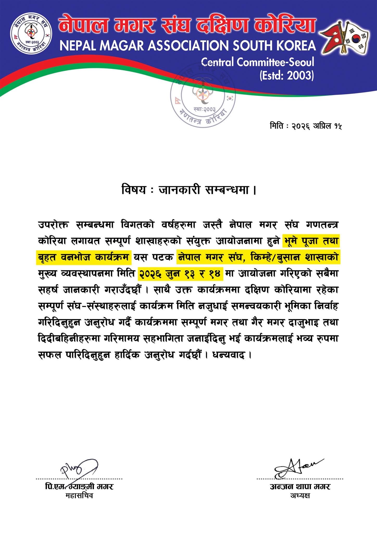 संघद्वारा जारी सूचनाअनुसार, २०२६ जुन १३ र १४ तारिखमा हुने भुमे पूजा तथा वृहत बनभोज कार्यक्रम किम्हे/बुसान शाखाको मुख्य व्यवस्थापनमा सञ्चालन हुनेछ। दक्षिण कोरियाभर रहेका सम्पूर्ण संघ–संस्थालाई समन्वयात्मक भूमिका खेल्न आग्रह गरिएको छ भने मगर समुदायसँगै अन्य नेपाली दाजुभाइ तथा दिदीबहिनीलाई पनि सहभागिताका लागि आह्वान गरिएको छ।