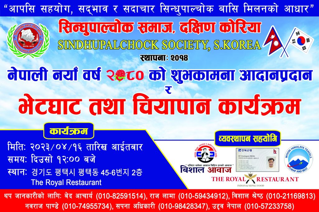विशाल श्रेष्ठ/दक्षिण कोरिया: “आपसि सहयोग सद्भाव र सदाचार सिन्धुपाल्चोक बासि मिलनको आधार” मुल नारा लिएर सन् २०१४ मा स्थापित सिन्धुपाल्चोक समाज दक्षिण कोरियाले आयोजना गर्न लागेको नेपाली हरुको नयाँ वर्ष २०८० को पावन अवसरमा यहि अप्रिल १६ तारिख आइतबार का दिन ठिक १२ बजे 경기도 평택시 평택동 45-6 번지 2 층 मा रहेको THE ROYAL RESTAURANT को हलमा शुभकामना आदानप्रदान र भेटघाट तथा चियापान कार्यक्रमको तयारी पुरा भएको छ।