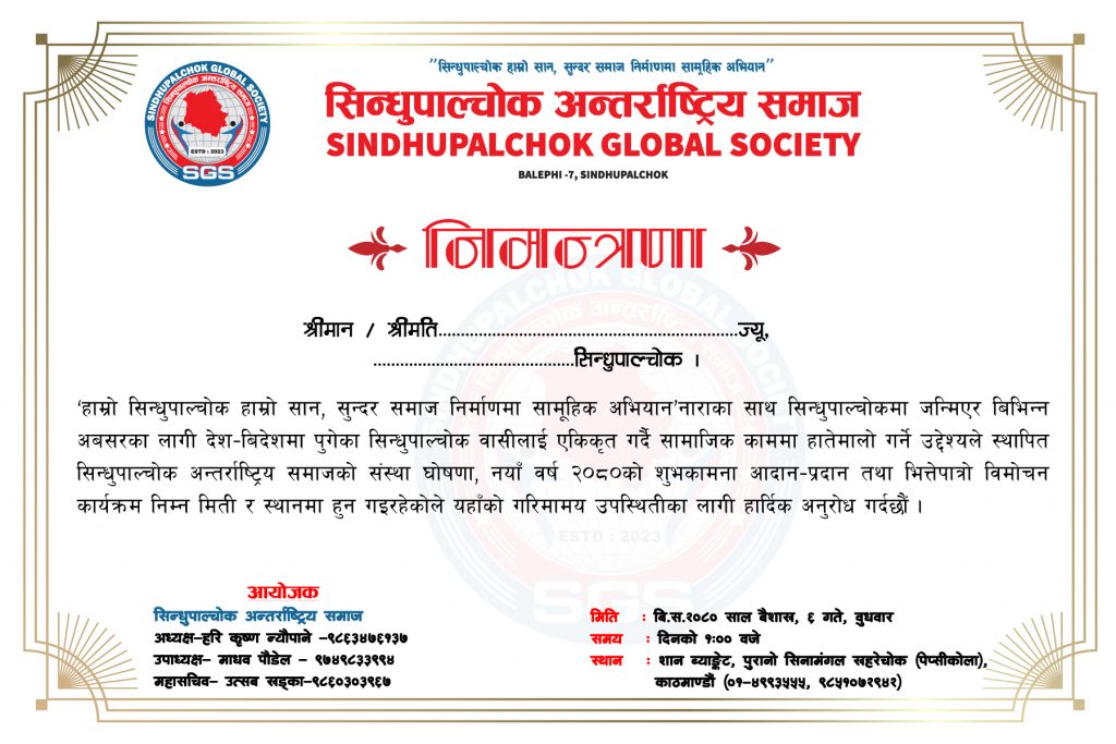 सिन्धुपाल्चोक अन्तर्राष्ट्रिय समाजको संस्था घोषणा, नयाँ वर्ष २०८०को शुभकामना आदान–प्रदान तथा भित्तेपात्रो विमोचन कार्यक्रमलाइ सभ्य, भव्य र व्यवस्थित रुपमा सफल पार्नको लागि सिन्धुपाल्चोक स्थायी घर भइ विभिन्न शिलशिलामा विभिन्न स्थानमा रहनु भएका लगायत सम्भव हुने सम्पुर्ण नेपाली हरुमा उपस्थितिको लागि आयोजकले हार्दिक निमन्त्रणा गरेको छ।