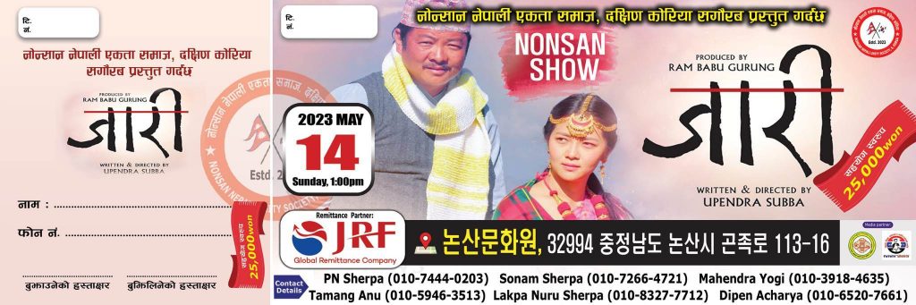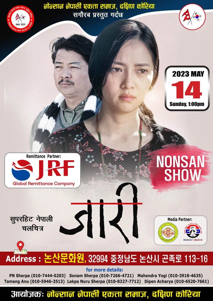 नोन्सान नेपाली एकता समाजको निर्माण पुरा गरि औपचारिक रुपमा कार्यसमितिले पहिलो कार्यक्रम नेपाली चलचित्र “जारी” प्रदर्शन गर्न गइरहेको हुनाले ,समाजको पहिलो कार्यक्रम हुनाका साथै 논산 र आसपासका क्षेत्रहरूका सम्पुर्णको साथ सहयोग आस गरेको आयोजकले बताएको छ। साथै चलचित्र प्रदर्शन गरि यस बाट उठेको रकम यसै क्षेत्रमा सेल्टर स्थापना कोषमा रहने र आगामी दिनहरूमा कार्यक्रम आयोजना लगायत विभिन्न सामाजिक कार्यमा प्रयोग गरिने हुनाले पहिलो कार्यक्रम लाई सबैले चलचित्र हेरेर साथ दिन र आगामी दिनमा पनि यस्ता कार्यक्रम आयोजना गर्न हौसला बढाउन सहयोग गर्नुहुन 논산 र आसपासका क्षेत्रहरूका रहनुहुने सम्पूर्ण नेपाली हरुमा आयोजकले हार्दिक निमन्त्रणा गरेको छ।