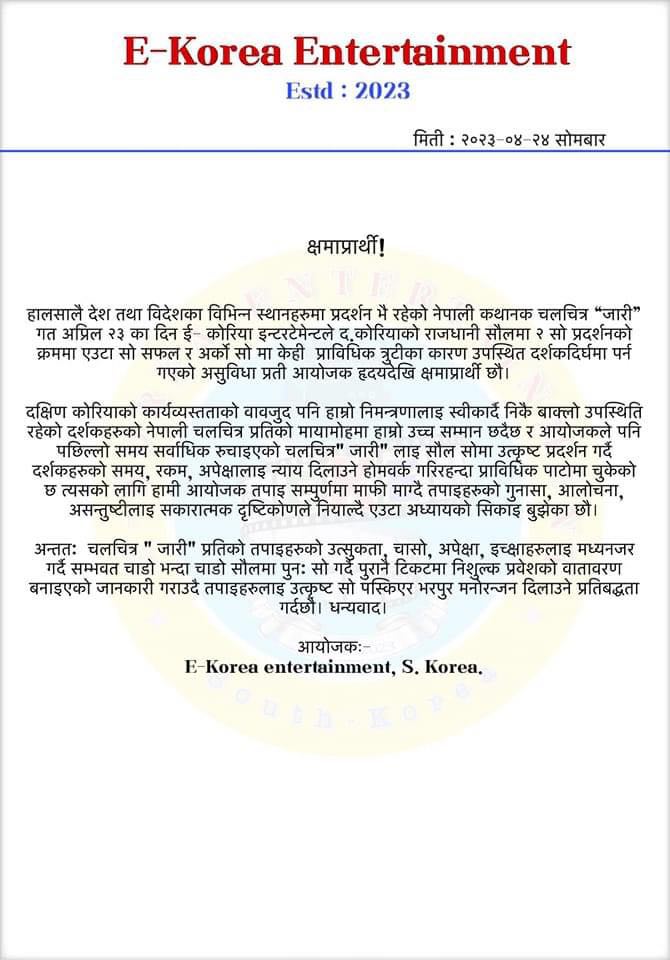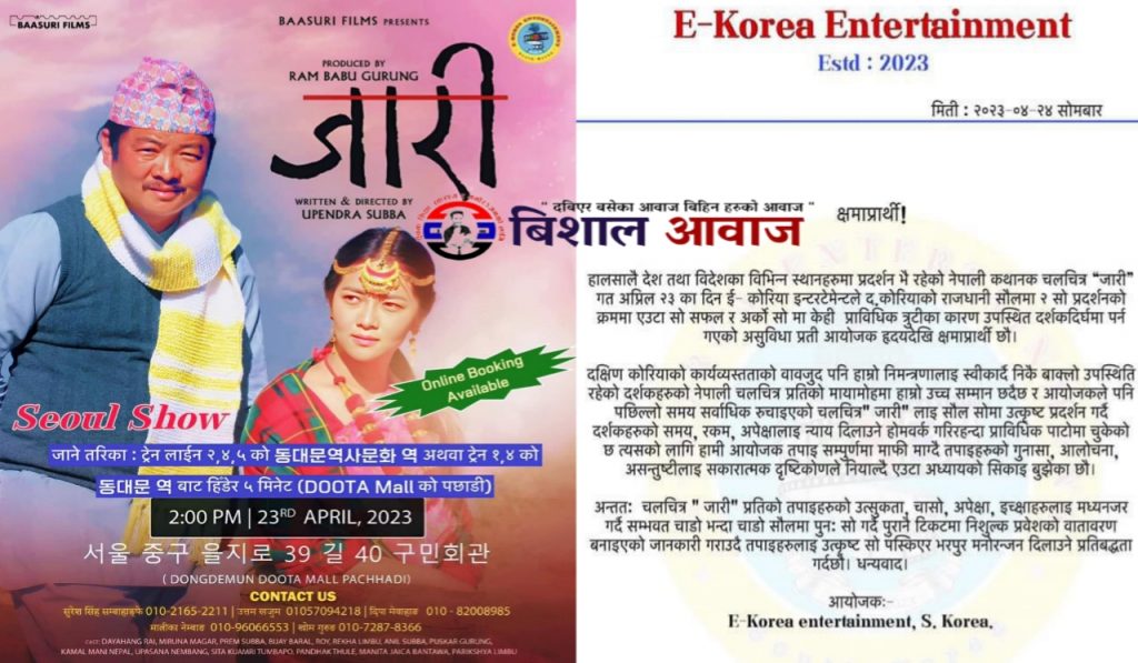 विशाल श्रेष्ठ/दक्षिण कोरिया:इ-कोरिया इन्टरटेन्मेन्टको आयोजनामा सामाजिक कथावस्तुमा आधारित चलचित्र जारी गत आइतबार दक्षिण कोरियाको सउल दोङ्देमुनको नजिकै हाउसफुलका साथ तर विवादस्पद तरिकामा प्रदर्शन सम्पन्न भएको थियो। चौतर्फी आलोचना आएपछि उक्त गल्ति लाइ स्विकार्दै पुरानो टिकट काटेर हेरेर मज्जा नभएका हरु लाई त्यही टिकटमा हेर्ने व्यावस्था गर्ने आयोजकको निर्णय गरेको छ।