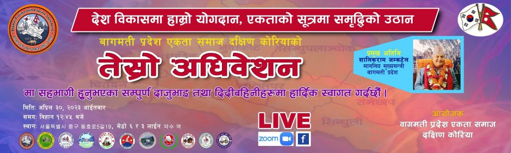 बागमती प्रदेशको माननिय मुख्य मन्त्री शालिकराम जमकट्टेल प्रमुख अतिथि तथा नेपाली राजदुतावास सौलको उपनियोग प्रमुख पुष्पराज भट्टराईको विशेष अतिथि मा हुन लागेको बागमती प्रदेश एकता समाजको तेश्रो अधिवेशनको लागि जिल्लागत अधिबेशन प्रतिनिधि छनोट,अधिबेशन प्रतिनिधिहरुको नामावली प्रकाशन तथा अधिबेशन प्रतिनिधिहरुको अन्तिम नामावली समेत प्रकाशन गरेर अन्तिम तयारीमा जुटिसकेको अध्यक्ष रवि प्रताप घिसिङले विशाल आवाज संग कुरा गर्ने क्रममा बताउनुभयो। स्थापनाकालदेखि नै यस संस्थाले कोरियामा विभिन्न पेशा तथा व्यवसायमा आबद्द बागमती प्रदेशवासीहरू बीच आपसी सहयोग, समझदारी, सद्भाव र भाइचारा अभिबृद्दि गर्दै कोरिया स्थित बागमती प्रदेश अन्तर्गत पर्ने विभिन्न जिल्लागत संस्थाहरु बीचको सहकार्य, सह-अस्तित्व र समन्वय मार्फत जिल्लागत संस्थाहरुको गतिविधिहरुलाई थप व्यवस्थित प्रभावकारी पारदर्शि मितब्ययिता र एकरुपता बनाउदै आएको छ।