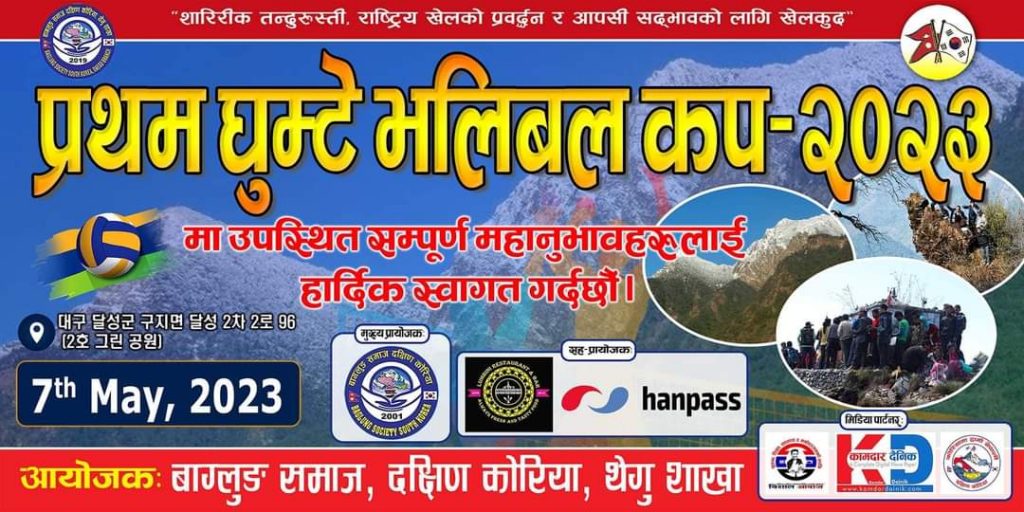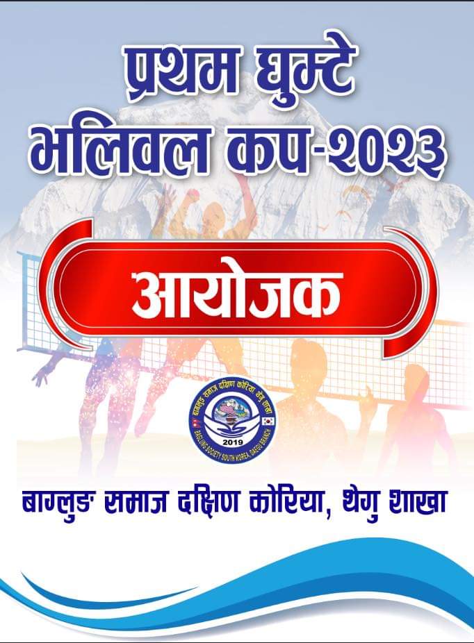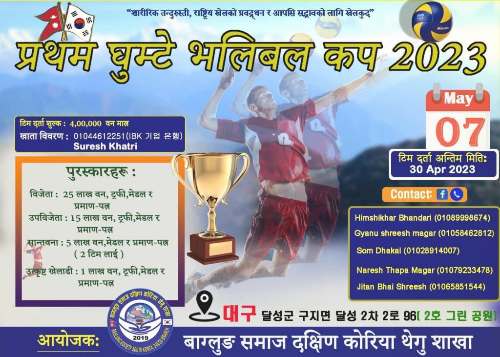 विशाल श्रेष्ठ/दक्षिण कोरिया:बाग्लुङ समाज दक्षिण कोरिया थेगु शाखाको आयोजनामा मे ७ मा हुन लागेको अहिले सम्मकै ठुलो धनराशीको प्रथम घुम्टे भलिबल कप २०२३ को तयारी लगभग पुरा हुन लागेको छ। ४ लाख वन टिम दर्ता शुल्क रहेको बाग्लुङ समाज दक्षिण कोरिया थेगु शाखाको आयोजनामा हुने उक्त प्रतियोगिताका लागि टिम दर्ताको अन्तिम मिति अप्रिल ३० सम्म राखिएको छ।