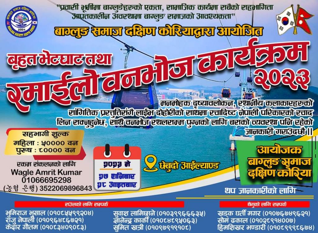 मे २७/२८ मा बाग्लुङ समाज दक्षिण कोरियाले बृहत भेटघाट तथा रमाइलो वनभोज कार्यक्रम २०२३ गर्ने