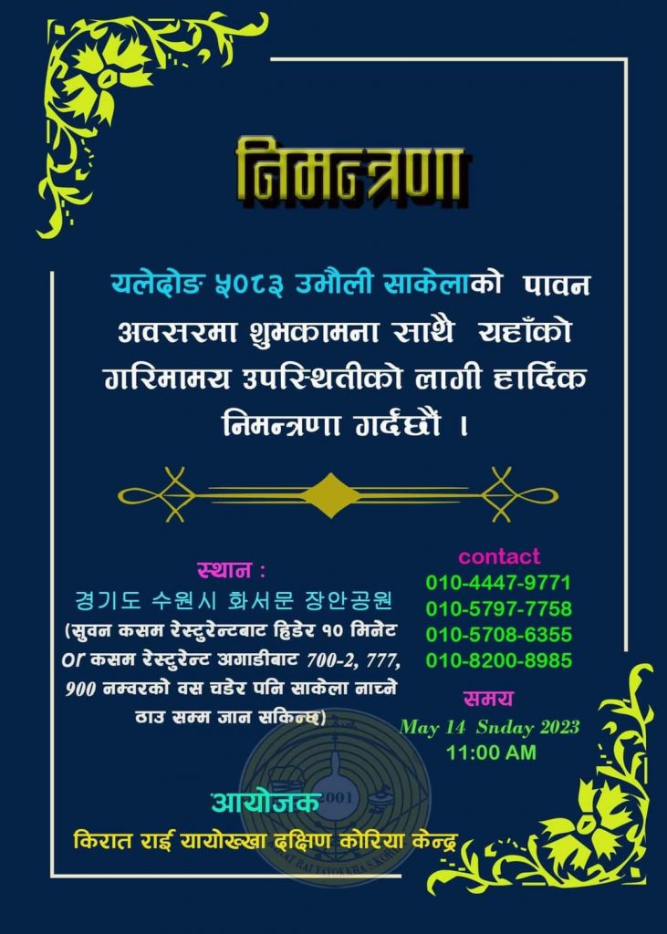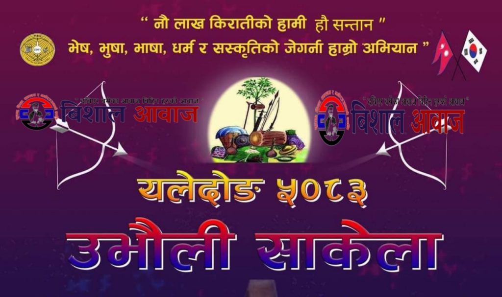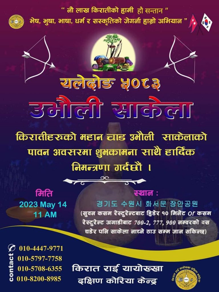 विशाल आवाज संवाददाता किरात राई यायोख्खा दक्षिण कोरियाले सधैँ झैँ यो बर्ष पनि येले दोङ्ग ५०८३ , उभौँली साकेलाको आयोजना गर्ने भएको छ। बिगत बर्षहरुमा राजधानी सोलस्थित थोंदेमुनको एक पार्कमा मनाईँदै आईएको साकेला कार्यक्रम यो पटक भने कोरियाको सुवन शहरको एक ह्वासमुन छांआन पार्कमा आयोजना हुने किराँत राई यायोख्खाले जनाएको छ। ” नौ लाख किराँतीको हामी हौँ सन्तान, भेष- भुषा , भाषा-धर्म र संस्कृतीको जगेर्ना हाम्रो अभियान ” भन्ने मूल नारा सहित साकेला उभौँली किराँत राई जातीहरुको महान चाँड कोरियामा यही मे महिनाको १४ तारिक आईतबार मनाईने भएको हो।