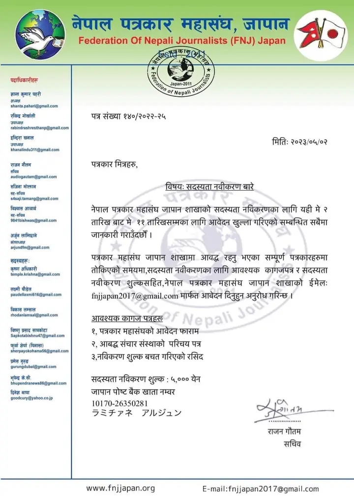 प्रमोद गिरी हिरोसिमा। नेपाल पत्रकार महासंघ जापान शाखाले सदस्यता नविकरण आवेदन खुल्ला गरेको छ । शाखाका सचिव राजन गौतमले दिएको जानकारी अनुसार आज में २ तारिखबाट में ११ तारिखसम्म आबेदन खुल्ला गरिएको हो ।