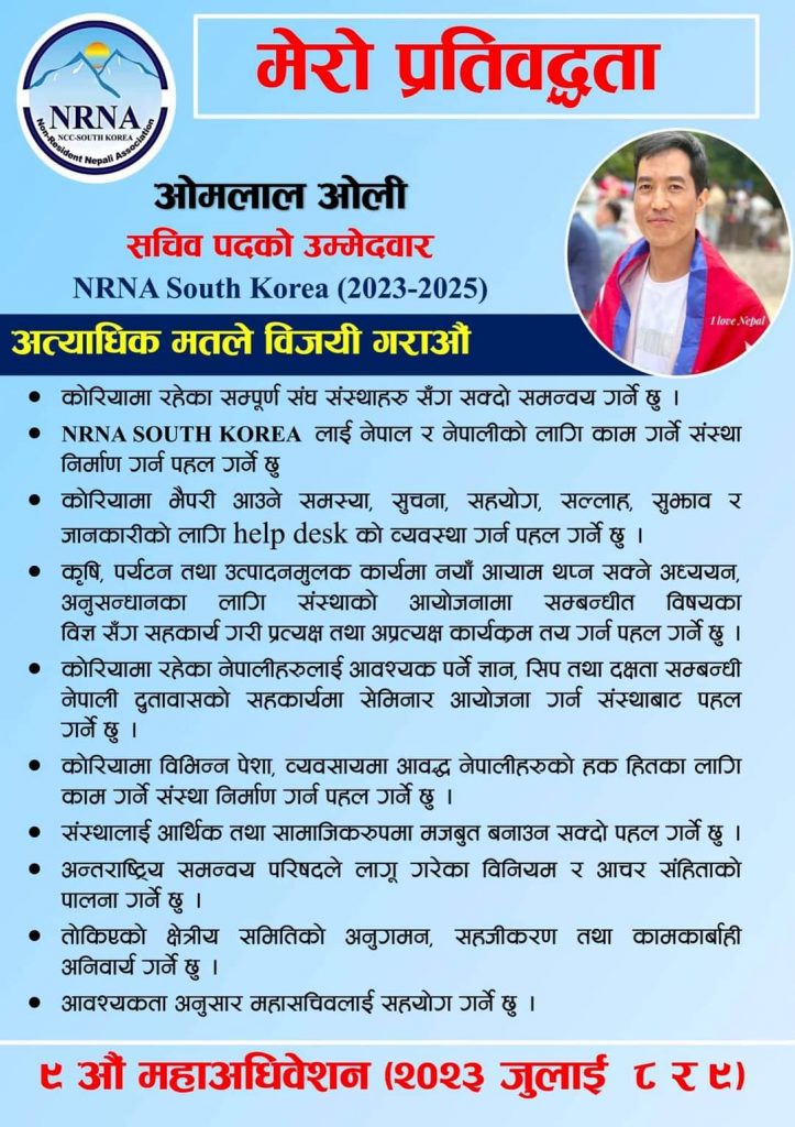 विशाल श्रेष्ठ/दक्षिण कोरिया:गैर आवासीय नेपाली संघ कोरियाको आगामी दुई बर्ष( २०२३-२०२५)का लागि नयाँ संगठनमा नयाँ नेतृत्व चयन गर्ने बेला भएकोले नेतृत्व लिन चाहाने एनआरएनहरुको दौडधुप, प्रचार-प्रसार र लविङ तीब्र बन्दै गएको छ ।आगामी आउदो जुलाइ ८/९ तारिख मा हुन गइरहेको गैर आवासीय नेपाली संघ कोरिया(एनआरएनए दक्षिण कोरिया) को नवौ महाअधिवेशनको लागि दक्षिण कोरियाको सक्रिय सामाजिक अभियान्ता ओमलाल ओलिले सचिव पदमा उम्मेदवारी दिने भएका छन्।