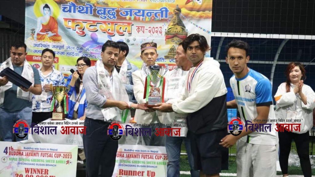 विशाल श्रेष्ठ/दक्षिण कोरिया:BUDDHA WAS BORN IN NEPAL( बुद्व को जन्म स्थल नेपाल) भन्ने मुल नारा का साथ नेपाल तामाङ घेदुङ ख्यङ्.बु.शाखा को महिला आवास गृह नाना आङा धिम सहयोगार्थ 경남 김해시 김해대로 1798 (조은풋살장) मा कोरिया स्थित नेपाल तामाङ घेदुङ दक्षिण कोरिया ख्यङ्साङ बुसान शाखाले मे २८ तारिखका दिन आयोजना गरेको “चौथो बुद्ध जयन्ती फुटसल कप-२०२३” फारान एफसिले चुम्न सफल भएको छ।