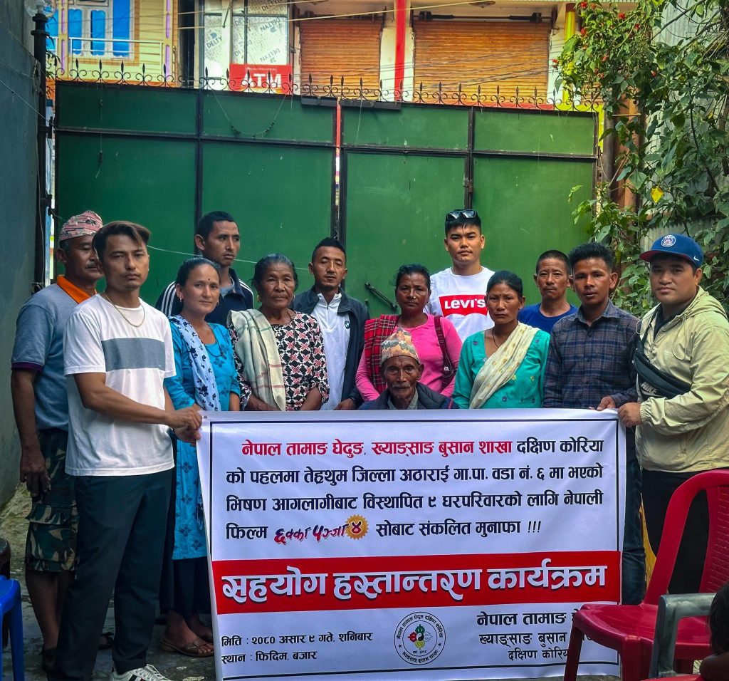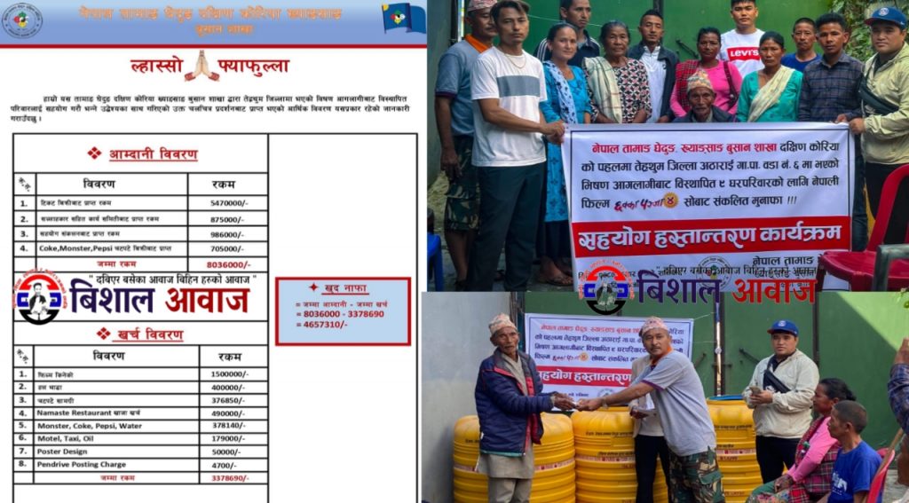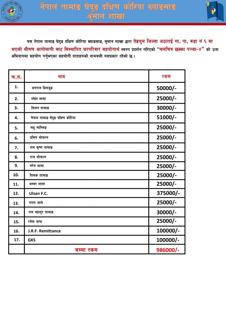 दक्षिण कोरिया: मनोरञ्जन का साथ साथै सहयोग गरौं भन्ने उदेश्यको साथ तेह्रथुम जिल्लाको अठाराई गाउपालिका वार्ड न. ६ मा भएको भीषण आगोलागी बाट विस्थापित घरपरिवार सहयोगार्थ तामाङ घेदुङ ख्यङ्साङ् शाखाले प्रदर्शन गरिएको नेपाली कथानक चलचित्र छक्का पन्जा ४ GIMHAE busan show को आर्थिक विवरण सार्बजनिक गरिएको छ ।