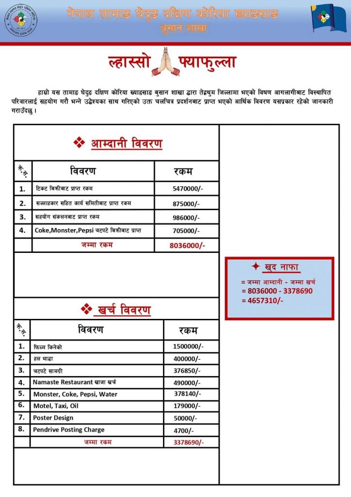 चलचित्र छक्का पन्जा ४ GIMHAE busan प्रदर्शन कार्यक्रमको आर्थिक विवरण सार्वजनिक ३५ लाख वन आगोलागी पिडित परिवारलाई सहयोग !