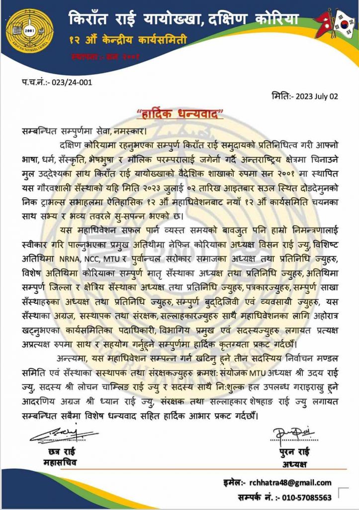 महाधिवेशन सम्पन्न गर्न खटिनु हुने कार्यसमिति लगायत तीन सदस्यिय निर्वाचन मण्डल, निःशुल्क हल उपलब्ध गराइराख्नु हुने ध्यान राई ज्यु, संरक्षक तथा सल्लाहकार शेषहाङ राई ज्यु लगायत सम्बन्धित सबैमा नया कार्यसमितिको तर्फबाट विशेष धन्यवाद सहित हार्दिक आभार प्रकट गर्नुभएको छ।