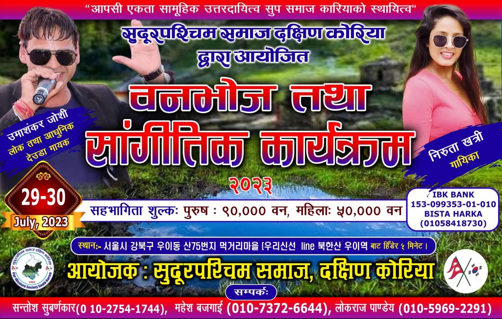 लोकराज पाण्डे/दक्षिण कोरिया:सुदुरपश्चिमबासिको साझा संस्था सुदुरपश्चिम समाज दक्षिण कोरियाले “आपसी एकता सामूहिक उत्तरदायित्व, सुप कोरियाको स्थायित्व” भन्ने मूल नाराका साथ यहि मिति २०२३ जुलाई २९ र ३० गतेका दिन “वृहत बनभोज तथा साङ्गीतिक कार्यक्रमको आयोजना” गर्न लागेको उक्त कार्यक्रमका संयोजक लोकराज पाण्डे ले जानकारी गराउनु भएको छ।