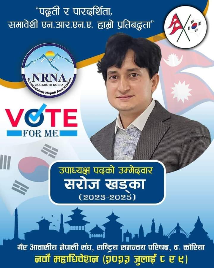 गैर आवासीय नेपाली संघ दक्षिण कोरियाको आगामी दुई बर्ष( २०२३-२०२५)का लागि सरल सहज स्पष्ट अनि मिलनसार स्वभावका कोरियामा सक्रिय सामाजिक ब्यक्तित्व सरोज खड्काले उपाध्यक्ष पदको लागि उम्मेदवारी दिनु हुने भए पछि दक्षिण कोरियामा उपाध्यक्ष पद लाइ एकदमै महत्वपूर्ण साथ हेरिएको छ।